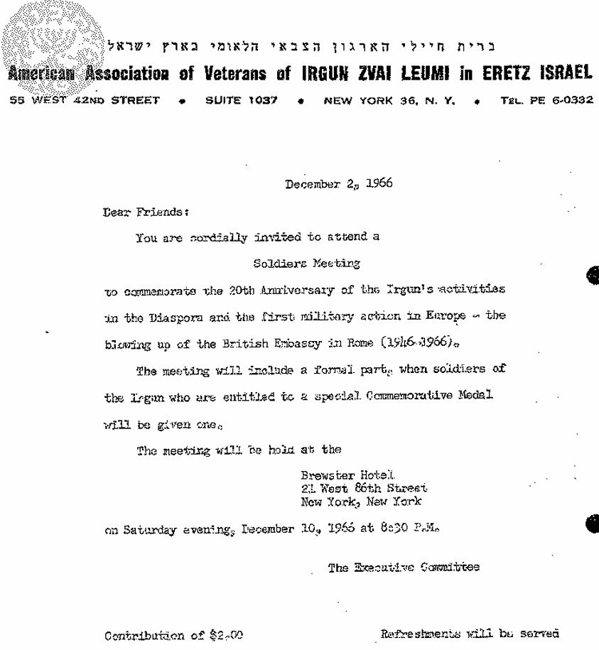 Second Front 1946-1966 Back: Emblem of the Etzel above the text Hativat Hagola (Diaspora Division) Diameter 35 mm The Etzel issued this medal to their members abroad in 1966, celebrating 20 years of opening the "second front" against the British, by blowing up the British Embassy in Rome. Click here to see the invitation to a ceremony held in New York where the medals were distributed. |