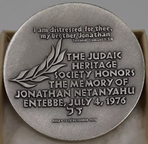 1976 Medal commemorating the Memory of Jonathan Netanyahu. Struck in .999 Fine Silver by Medallic Art Company, Weight 32.6 g. Diameter 38 mm |