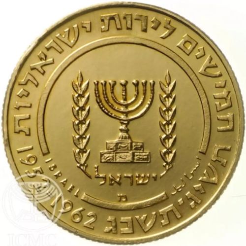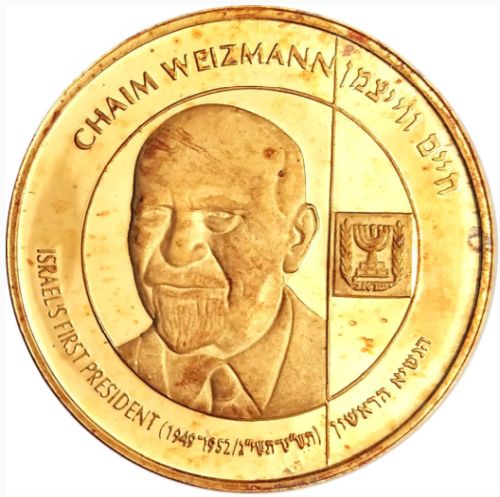 100 Lirot Coin Tenth Anniversary of Weizmann's death Gold 916 1963 Diameter 33 mm Weight 26.68 g. Israel Coins and Medals Corp. Made in the State Mint, Bern, Switzerland |