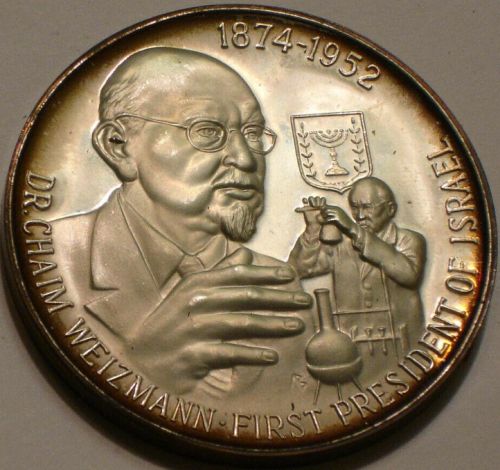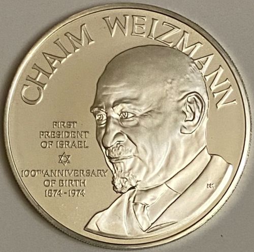 President of Israel 1874 - 1952 Silver Medal grading Gem Proof.This medal is struck in .925 fine silver with a diameter of 1 & 3/4 inches and a total weight of 41.66 grams. |