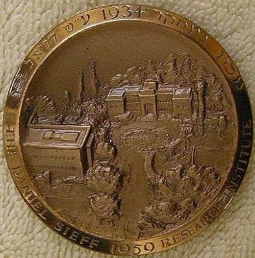 Anniversary Medal, 1959 . Bronze 50.4mm. Designed by Robert Berks. Front: Bust of Chaim Weizmann (1874-1952).Beveled edge contains the legend "Weizmann Institute of Science" in both English and Hebrew. Back: Aerial view of the compound housing the buildings of the Weizmann Institutes of Biochemistry, Biophysics and Technology, the residence of Chaim Weizmann and the Daniel Sieff Research Institute all in Rehovot, Israel. On the edge is the legend "the Daniel Sieff Research Institute". |
