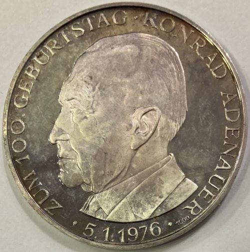 German medal Front: David Ben Gurion with German Kanzler Konrad Adenauer New York Waldorf Astoria - Die Aussöhnung mit den Juden (The Reconciliation with the Jews) Back: to the 100th birthday of Konrad Adenhauer 5.1.1976 Silver 25.03 g. Diameter: 40 mm |