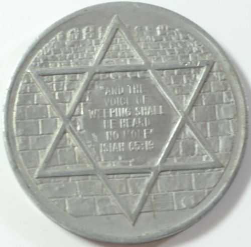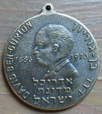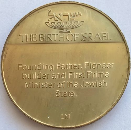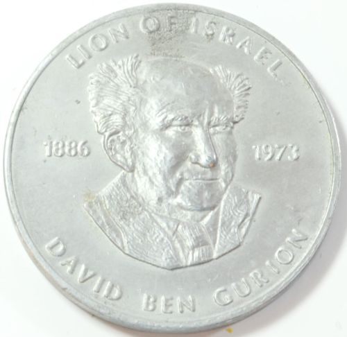Rare Ben Gurion pewter medal Front: Ben Gurion's portrait, the years of his life 1886-1973 and the caption 'Lion of Israel' Back: Star of David with the English quote "and the voice of weeping shall be heard no more Isiah 65:19" on the other. Diameter: 50 mm. |