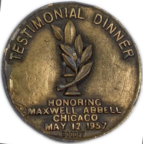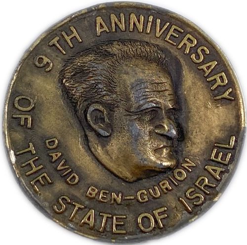 Independence Day of the State of Israel 1957 - 40 mm 24.43 g Front: The figure of Prime Minister David Ben-Gurion Back: Symbol of the officer and dedication in honor of Maxwell Abel The medal measures 40 millimeters and is cast in white metal, which was subsequently bronze plated. This medal was issued, as a souvenir, for a testimonial dinner given, on the ninth anniversary of the establishment of the State of Israel, in honor of Maxwell Abbell, Chicago real estate mogul and outstanding financial contributor to the Zionist cause. He died on July 9, 1957, less than two months after his testimonial dinner. |