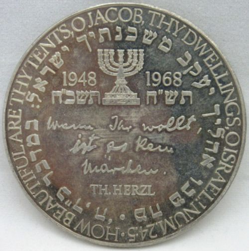 Israel Front: David Ben Gurion Promulgator and First Prime Minister of the New Israel Back: How Beautiful Thy Tents, O Jacob, Thy Dwellings, O Israel Num.24:5 1948 1968 Wenn Ihr wollt, ist es kein Märchen. Th. Herzl (If you will, it is no fairy-tale) Weight: 40 g. Diameter: 50 mm. |