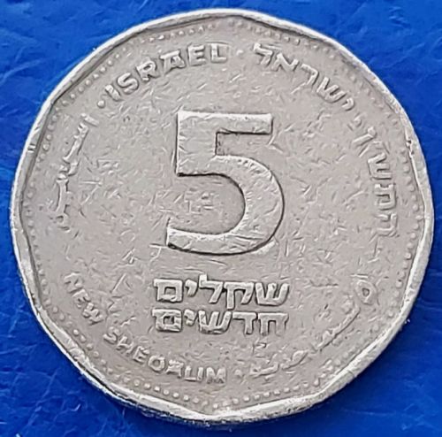 5 New Isreali Sheqel Coin 1990 Israeli Currency, as can be seen Design Gabi Neumann Diameter 24 mm Metal: Copper 75%, nickel 25%. |