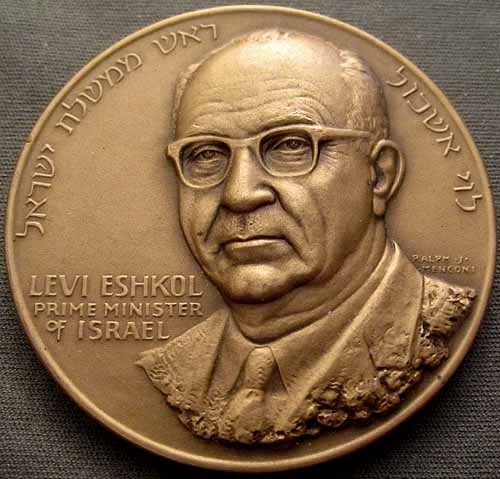 Front: Levi Eshkol "Prime Minister of Israel" with left facing relief portrait and English/Hebrew legend;