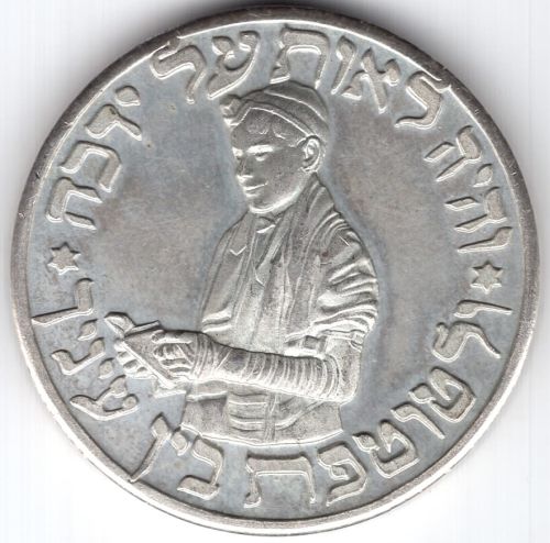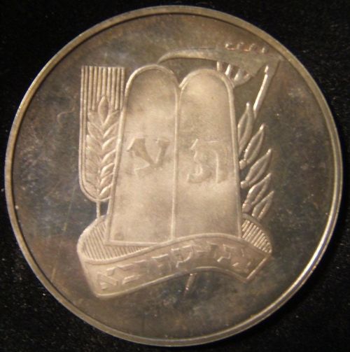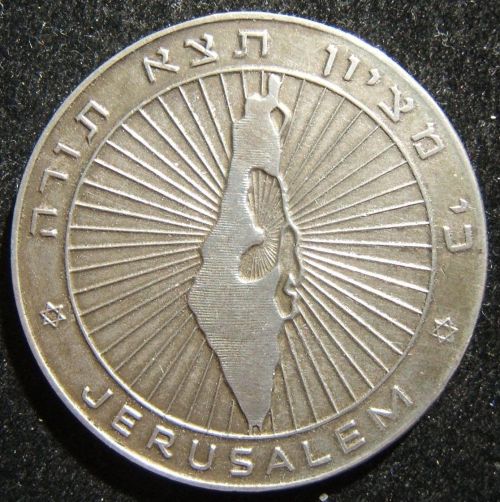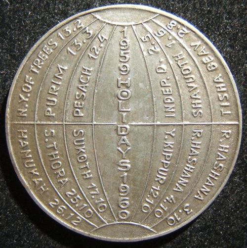 with Jewish Holidays 1959-60 Obverse: shaded shape of Israel (per 1949 borders) within circle, emitting rays; Hebrew with English legend "For out of Zion shall go forth the law (Isaiah 2 v3)] | Jerusalem". Reverse: a globe device split into segments to highlight the business calendar dates of Jewish holidays, with vertical legend in center "1959 Holidays 1960". Maybe Silver Diameter 35.75 mm Weight 17.05 gram |