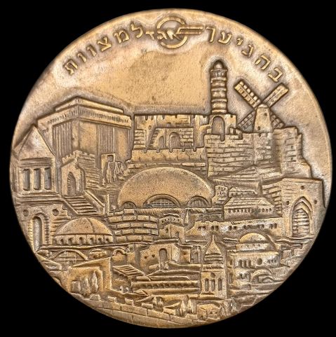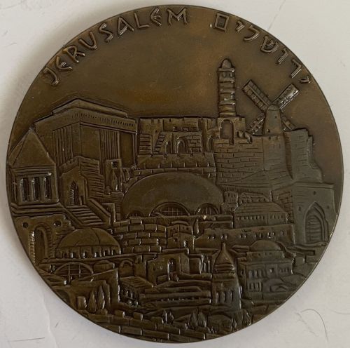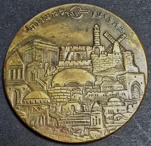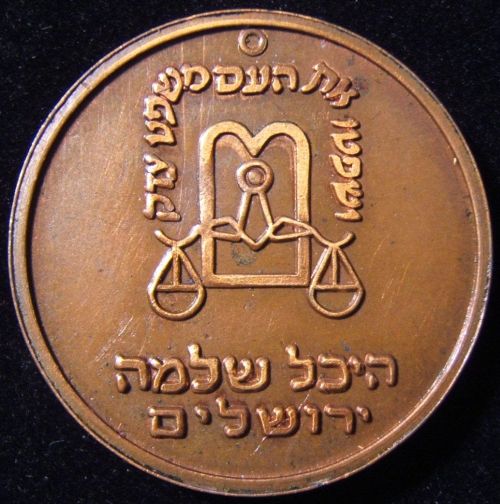 Heichal Shlomo, Jerusalem Medal of the complex which serves as the seat of the Israeli Chief Rabbinate since 1958, named after Shlomo Wolfson, the father of Sir Isaac Wolfson, who donated the money for the contruction of the building. The medal depicts an image of the building on the obverse with the emblem of the Chief Rabbinate surmounted by a quote from the Bible "And They Judged the Nation with Fair Justice" (Deuteronomy/Dvarim 9-7, 18) and Hebrew legend "Heichal Shlomo Jerusalem" on the reverse. Bronze Diameter 30 mm Weight 18.15 gram |