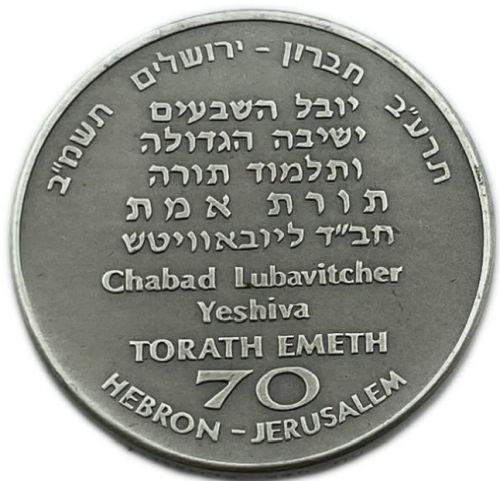 Yeshiva in the City of Hebron 1982 Silver 935 Diameter 35 mm Weight 30 gram Torat Emet in the city of Hebron was founded in 1901 by the Rashb Rebbe. |