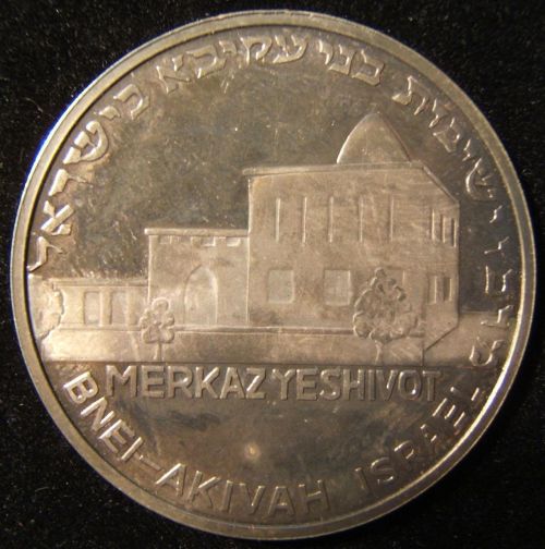 This medal commemorates the "Merkaz Yeshivot" (network of Jewish religious studies centers) of the "Bnei Akiva" ("Sons of Akiva") Zionist-religious youth movement. On the obverse of the medal is depicted the building of Bnei Akiva's first Yeshiva high school in the village of Kfar HaRoeh (built in 1939). The medal probably dates to 1989 (50th anniversary of the Merkaz Yeshivot). Silver 925 Diameter 36 mm Weight 14 gram |