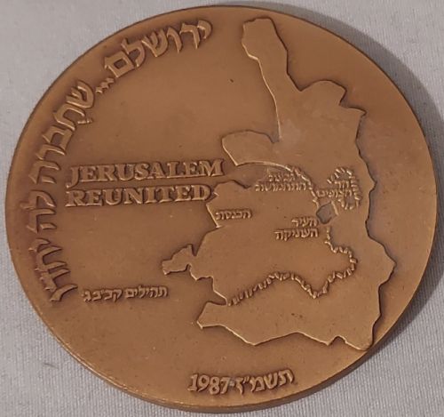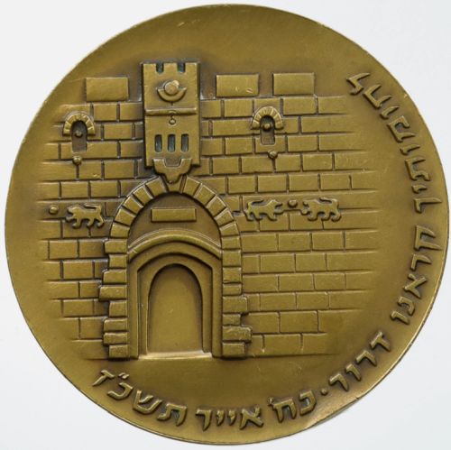 Medal – Jerusalem of Gold – Avraham Elisha 1967 The "Jerusalem of Gold" medal is the first numismatic-historical expression symbolizing the liberation of Jerusalem in the Six-Day War. The medal received unprecedented publicity and distribution in Israel and in many countries around the world. Due to the high demand, people lined up to register and order it. The medal was designed and issued by Avraham Elisha. Diameter 6 cm Bronze.114 gr |