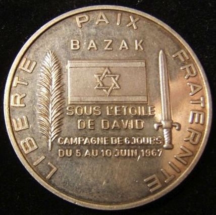mark; weight: 13.1g; Diameter: 33mm Front: a legend in Hebrew along the edge "With G-d's Will Was Saved the Peace of the World" with images of a plane, a tank and the Torah. Back: Flag of Israel with sword and olive branch on either side and a variation of the French national motto ("Liberty, Brotherhood, Equality) rendered here as "Freedom, Peace, Brotherhood", the Hebrew word "Bazak" ("swift") and "Under the Star of David, Campaign of 6 Days" and the period underneath; Possibly issued by French-Jewish volunteers in the war effort. Source: http://www.historama.com |