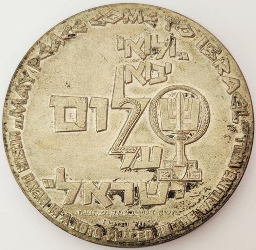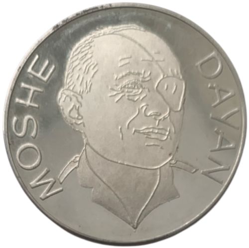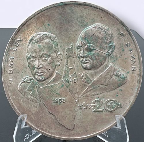 Dayan and text: "6 Day War" Back: Western Wall of Temple in Jerusalem, the candelabrum symbol of 20 years Independence celebrations and text: Israel Independence 20 Diameter: 40 mm Source: http://www.ebay.com |