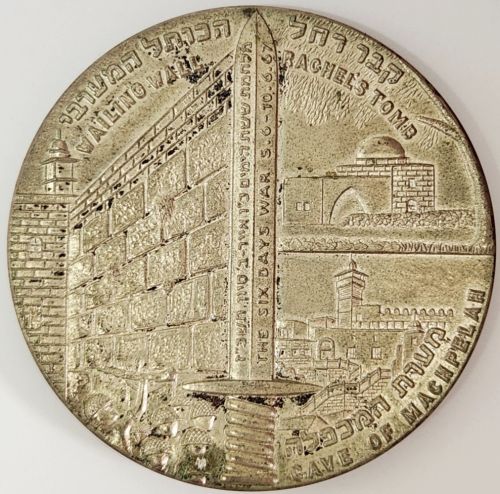 gate in Jerusalem, 7.6.1967 Back: Left: Western Temple Wall with soldiers, right: Rachel's and Cave of Machpelah, Middle: Sword with legend "The six days war 5.6.-10.6.1967. Diameter: 60 mm Material: Silver plated Source: http://www.ebay.com |