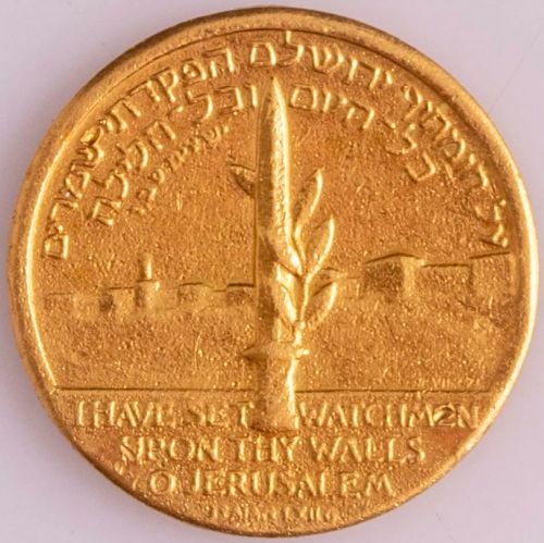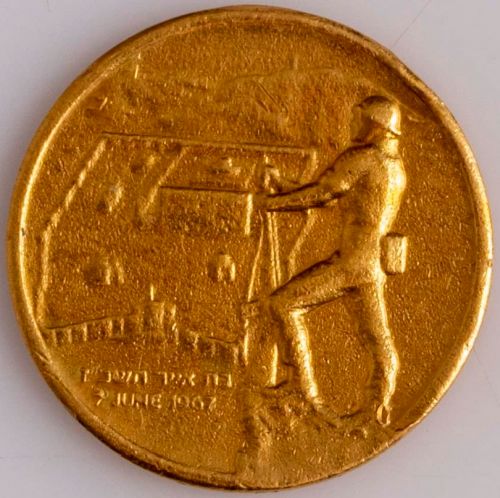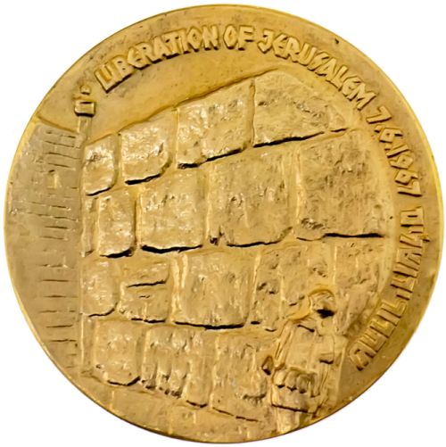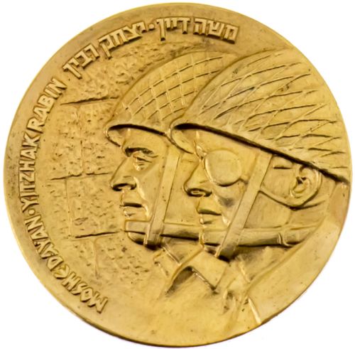 Six Day War Victory Gold Medal. 22k gold. Diameter 35mm. Weight 30.47gr. Issued by Shekel Front: Heads of Moshe Dayan and Yitzhak Rabin, legend in Hebrew and English of their names Back: Soldier praying at the Western Temple Wall, legend "Liberation of Jerusalem 7.6.1967" |