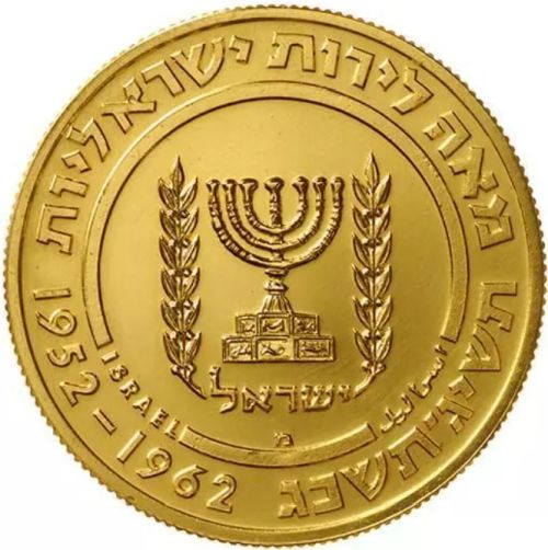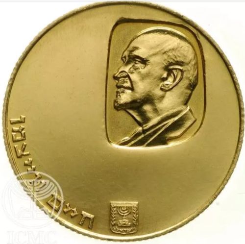 100 Lirot Coin Tenth Anniversary of Weizmann's death Gold 916 1963 Diameter 33 mm Weight 26.68 g. Israel Coins and Medals Corp. Made in the State Mint, Bern, Switzerland |