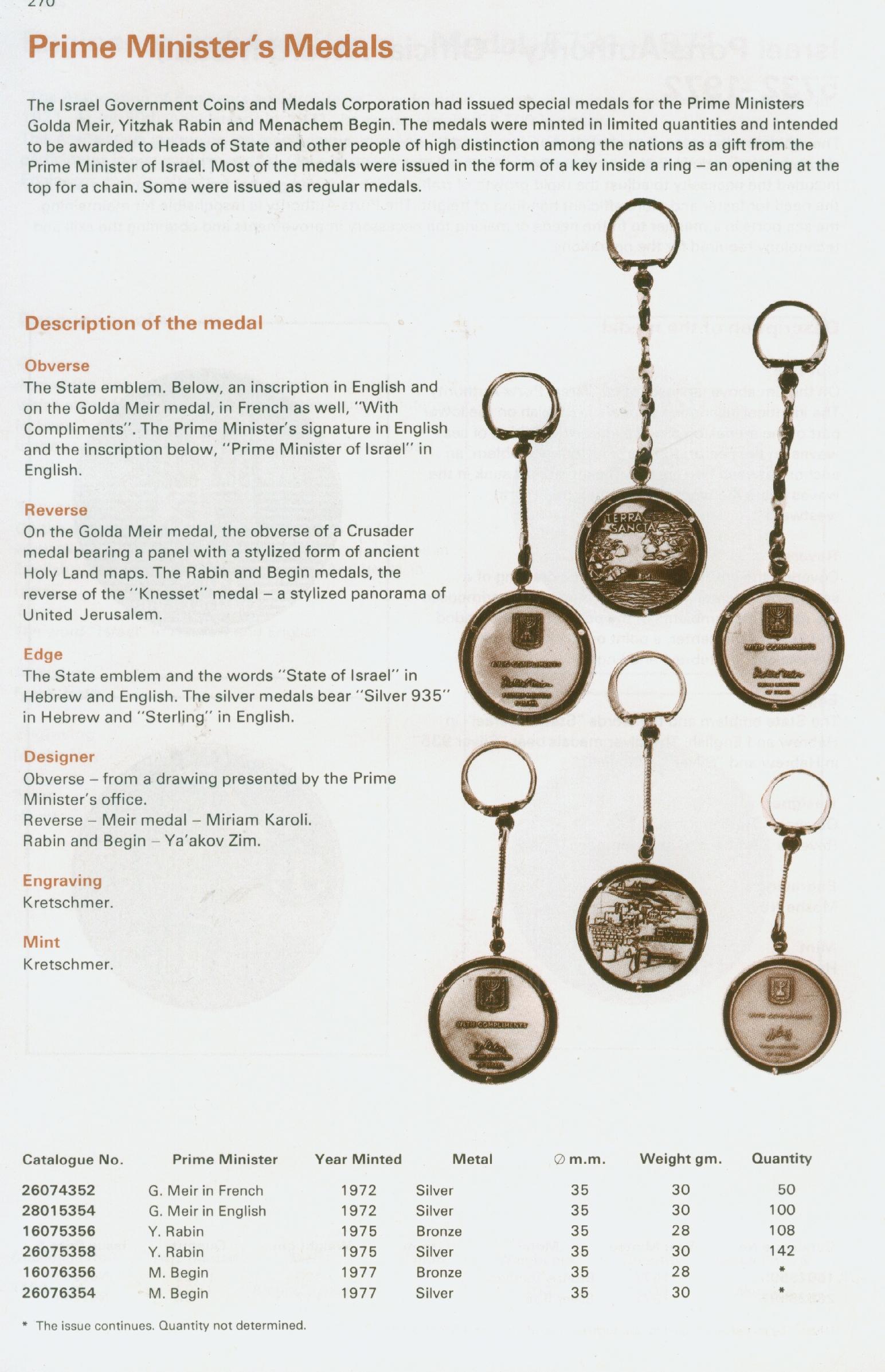 The Israel Government Coins and Medals Corporation had issued special medals for the Prime Ministers Golda Meir, Yitzhak Rabin and Menachem Begin. The medals were minted in limited quantities and intended to be awarded to Heads of State and other people of high distinction among the nations as a gift from the Prime Minister of Israel. Most of the medals were issued in the form of a key inside a ring - an opening at the top for a chain. Some were issued as regular medals. Medals of this type were issued for the Prime Ministers Golda Meir, Yitzhak Rabin and Menachem Begin.