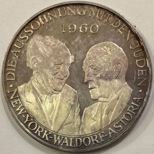 German medal Front: David Ben Gurion with German Kanzler Konrad Adenauer New York Waldorf Astoria - Die Aussöhnung mit den Juden (The Reconciliation with the Jews) Back: to the 100th birthday of Konrad Adenhauer 5.1.1976 Silver 25.03 g. Diameter: 40 mm |