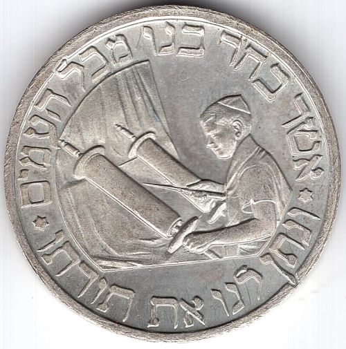 with Jewish Holidays 1959-60 Obverse: shaded shape of Israel (per 1949 borders) within circle, emitting rays; Hebrew with English legend "For out of Zion shall go forth the law (Isaiah 2 v3)] | Jerusalem". Reverse: a globe device split into segments to highlight the business calendar dates of Jewish holidays, with vertical legend in center "1959 Holidays 1960". Maybe Silver Diameter 35.75 mm Weight 17.05 gram |