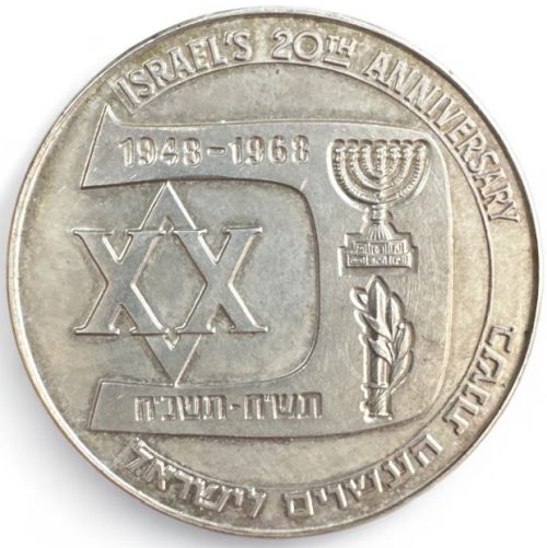 above the text Israel 20 Back: Symbol of the 20 years Independence celebrations in 1968. |
