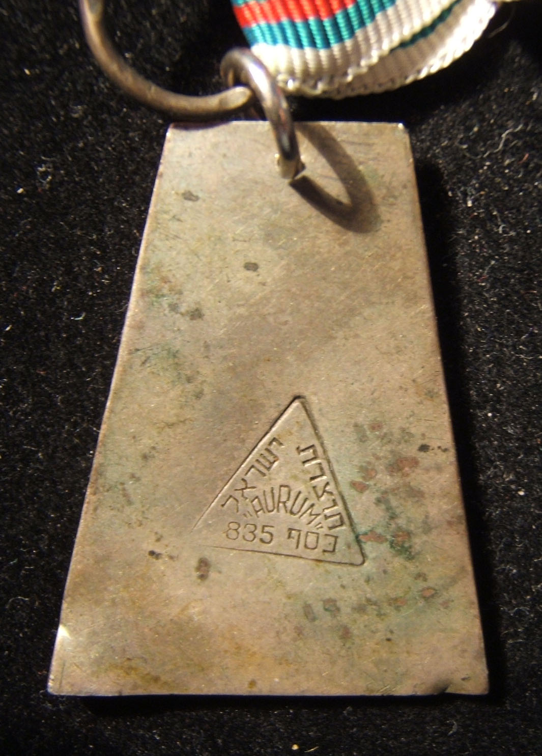 Forgers of the Way to Jerusalem" "Road of Heroism Monument" medal (ND), 1948-49; minted in silver by "Aurum" company; weight: 5.6g; size (medal + 1st ring): 28.5mm x 39mm. The medal is of trapezoid shape and depicts what is known as the "Heroism Road Monument", with legend in English "Monument to the Heroes of Jerusalem" on either side. On the monument, in Hebrew at top is the Biblical quotation "If I Forget Thee O Jerusalem May My Right Hand Forget its Cunning" with the IDF's emblem above, and further below among the bricks the words "Monument to the Forgers of the Way to Jerusalem" ("Gilad LePortzei Yerushalayim"). At left top is the number "17" inside the Hebrew letter "Mem" (perhaps meaning "Factory 17" - "Mifal 17"). The reverse is plain apart from the manufacturer's triangular stamp with "Product of Israel" in Hebrew and the text "silver 835". This is not an official Israeli Army medal, but it may have been issued privately to those involved in either the construction of the road to Jerusalem (which involved several foreign volunteers in the IDF - "Machal" members), or in the erection of the monument (1948). The erection of the monument crowns a vital achievement of the time: the completion of a bypass route to besieged Jerusalem, whose only route till then was the Latrun road (at that time, in spite of numerous Israeli attempts to capture it, in Jordanian Arab Legion control). The bypass originated as a plan of Col. David Marcus, called the "Burma Road" which was a dust road, rocky and winding and difficult to traverse, so a parallel wider road was built further south between September and December 1948, known as the "Road of Heroism" ("Kvish HaGvura"). The monument is one of a series now maintained by the Engineers Corps of the IDF. With thanks to the seller of this item: www.historama.com |